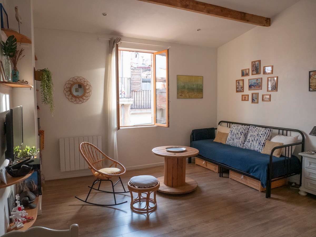 Nuestro apartamento es un T2 de 40 m² en el 1er piso de un pequeño edificio típico de una de las calles más animadas de Panier, a 200 metros del mar, La Major y Mucem. Consta de un dormitorio amueblado con una cama de 140, una gran sala de estar equipada con un sofá cama Ikea de 140, una bonita cocina con capacidad para 4 personas y un baño con ducha e inodoro. Libros para todas las edades, juegos de mesa, wifi, TV TDT, kit de planchado, ventilador, secador de pelo, sábanas, toallas, paño de cocina.