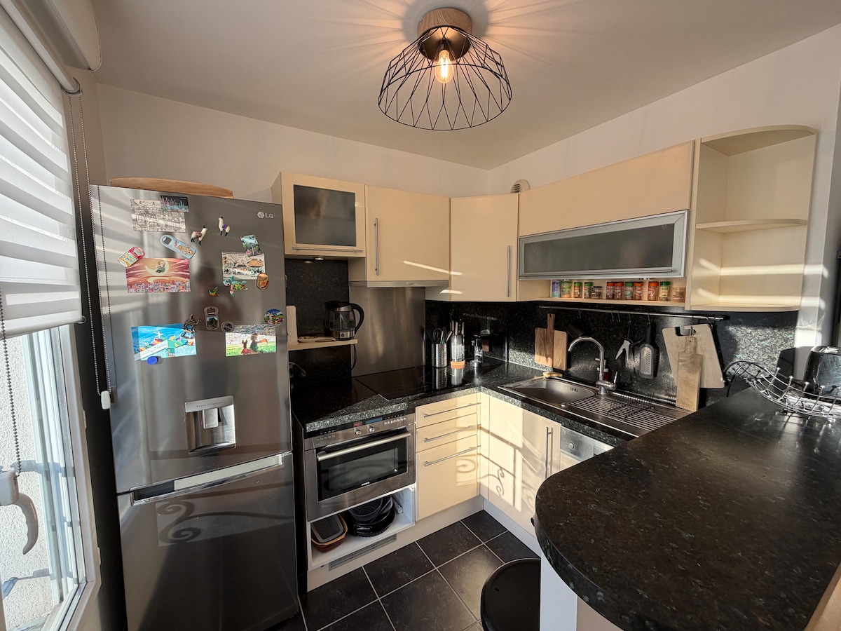 Relájese en este alojamiento tranquilo y elegante al pie del tranvía. Usted puede disfrutar de su terraza con vistas a la entrada peatonal privada y ajardinada. La cocina está totalmente equipada con internet de fibra de muy alta velocidad, con TV naranja. En el dormitorio, una cómoda cama garantiza una noche de descanso. El baño es nuevo y moderno. Plancha, secador de pelo, lavadora-secadora. Self check-in. No hay fiestas.