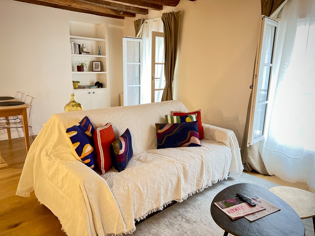 Disfrute de un estudio elegante y céntrico reformado. Situado a 25 minutos de París a 5 minutos a pie del RER A y en el corazón de Saint-germain-en-laye. Muy bien equipado, está pensado para sus estancias cortas y medianas: - Espacio habitable: sofá cama con un colchón de 160 cm y diseñado para dormir a diario - Gran bar de 1x2m2 para comer o trabajar - Televisor grande con 130 canales - Cocina equipada: máquina Nespresso, lavavajillas y ropa de cama - Cuarto de baño con toallas y productos (gel, champú)