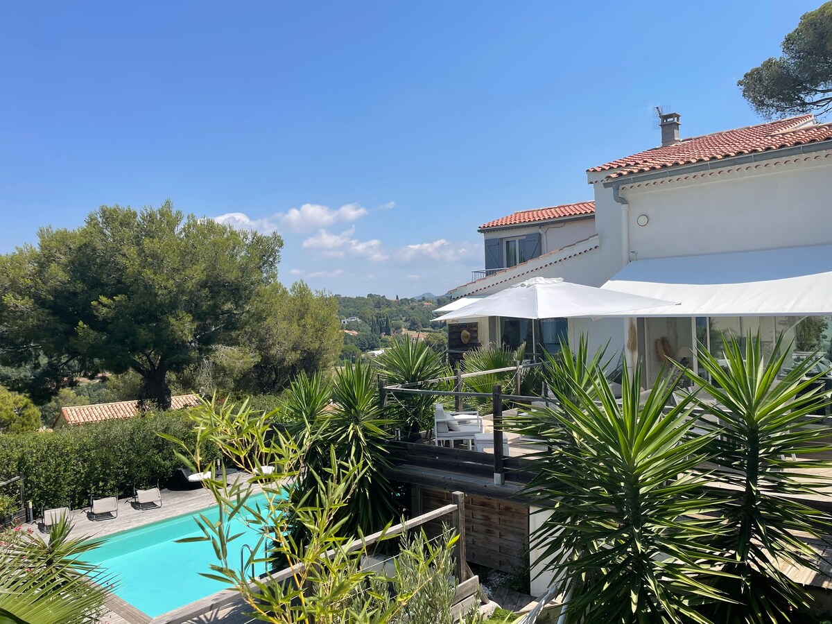 Villa de 230 m2 y apartamento independiente de 50 m2, 2 piscinas, jacuzzi interior, vistas al mar con impresionantes vistas de la rada de Toulon y su puesta de sol. Acceso al mar a 10 minutos andando (playa del Garona con base náutica, lado guijarro y un lado de arena). Acceso a 2 minutos a pie a la reserva natural del pegamento negro para magníficos paseos a pie o en bicicleta. Tiendas y restaurantes a pie