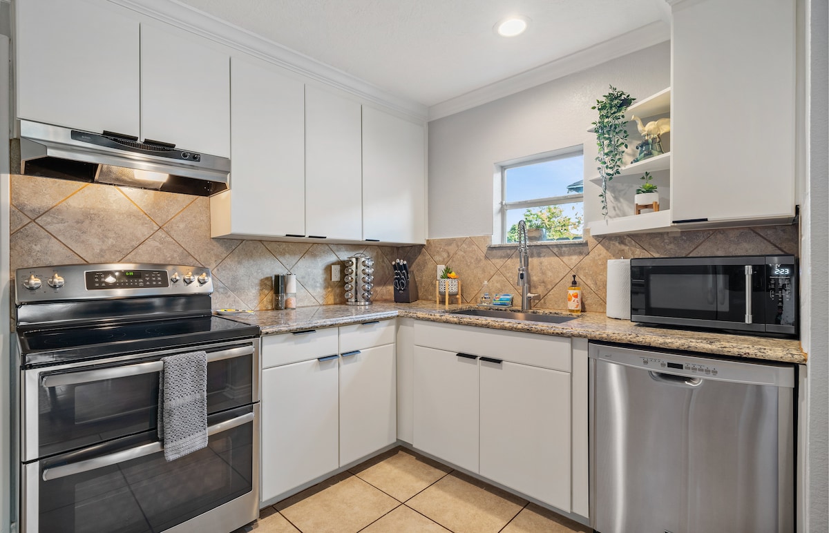 Regístrate en esta encantadora suite de invitados con entrada privada y estacionamiento fuera de la calle. ¡Ubicado en el centro, a solo 3 millas de las terminales de cruceros, a 4 millas de Moody Gardens y a 10 minutos a pie de la playa! La suite es una adición a un bungalow artesanal bien mantenido en un barrio residencial. Cuenta con muebles de madera maciza de calidad, decoración elegante y varias comodidades que incluyen cafetera con suministros de café, microondas, secador de pelo, TV inteligente, platos y asientos.