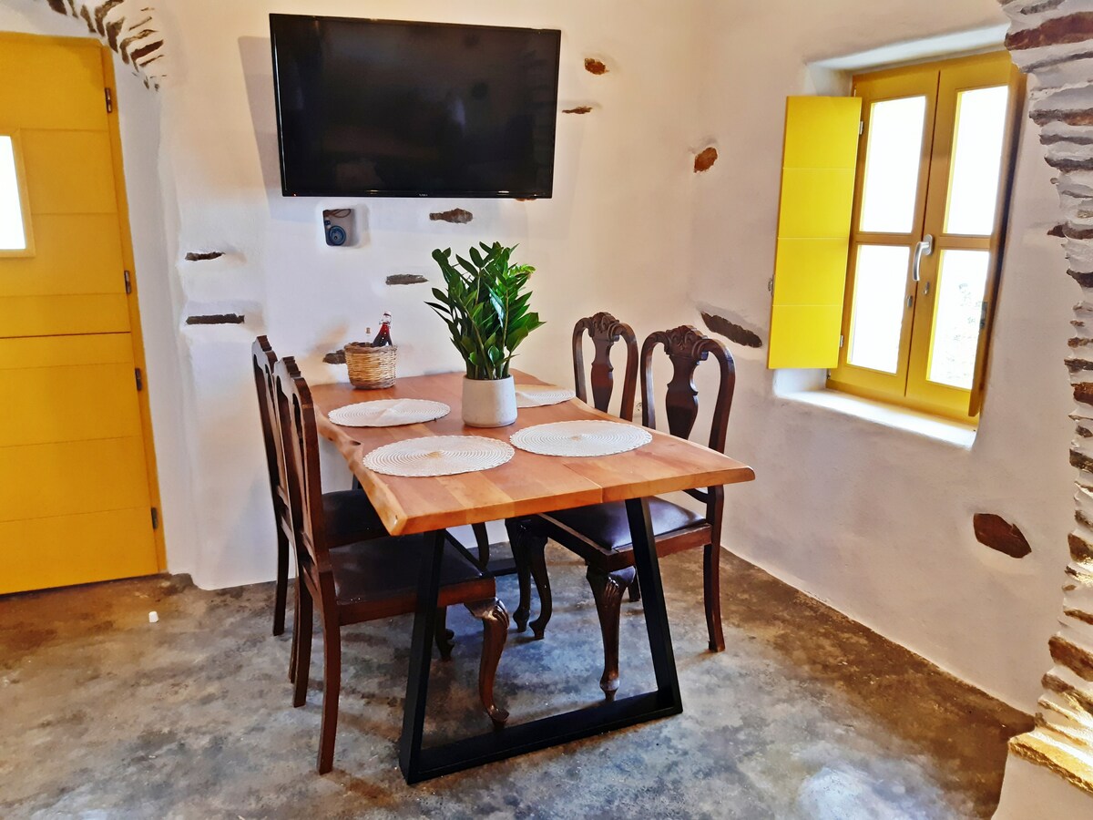 ¡Consulta nuestras increíbles reseñas de huéspedes que hablan por sí mismos! Casa de piedra galardonada con premios arquitectónicos y con más de 200 años de historia. Nuestra casa de campo es una casa tradicional cicládica con un carácter único. Renovada con altos estándares y atención a los detalles, combinando la comodidad con el máximo respeto por su patrimonio arquitectónico popular. Estamos seguros de que te encantará disfrutar de las increíbles vistas al mar, las montañas y el pueblo desde la terraza privada de la azotea de nuestro encantador alojamiento.