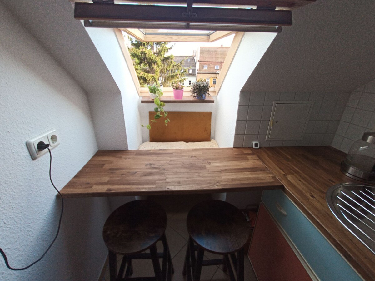Un pequeño apartamento (45 m2), encantador y céntrico en el ático en el este. Compras, cafés agradables, pubs y parques están a la vuelta de la esquina. Puedes residir cómodamente aquí para dos, pero en caso de duda también despliega el sofá (110x200 cm) y un colchón (80x200 cm). Hay un pequeño lavavajillas en la cocina, así que no hay estrés con los platos. Hay persianas al aire libre en el dormitorio y la sala, luego está completamente negra para dormir. En caso de duda, solo pregunta:)