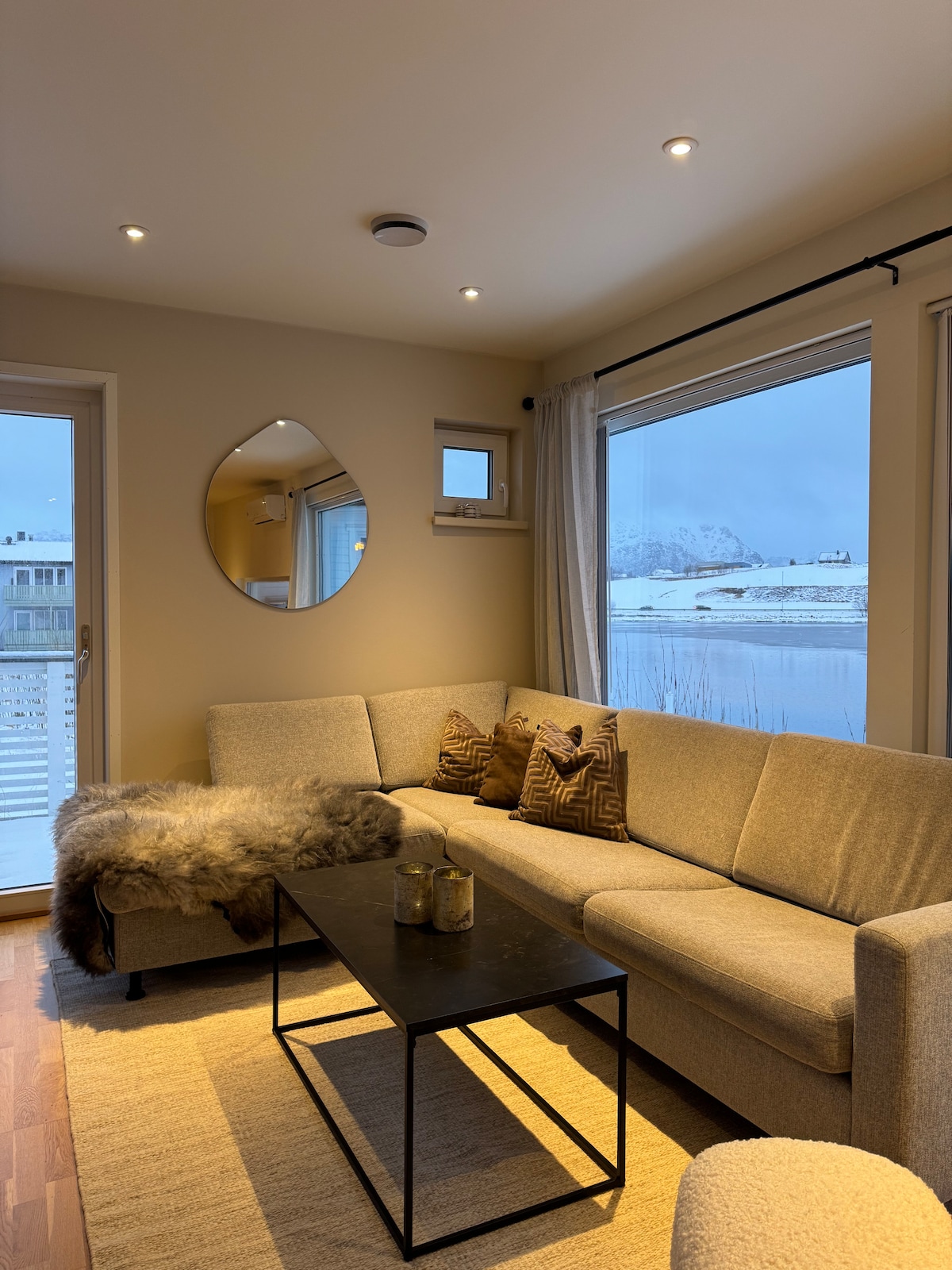 A beautiful seafront cabin designed for travelers who want both nature and comfort. Tucked along the shoreline with uninterrupted sea views, this cosy lodge is the perfect base for families, couples and remote-working adventurers looking to experience the best of Lofoten. With a sauna, two lounges + two bathrooms there is space for everyone! Wake up to soft morning light on the water, enjoy coffee on the deck, explore by day, and finish your evening Northern Lights watching right from the cabin.