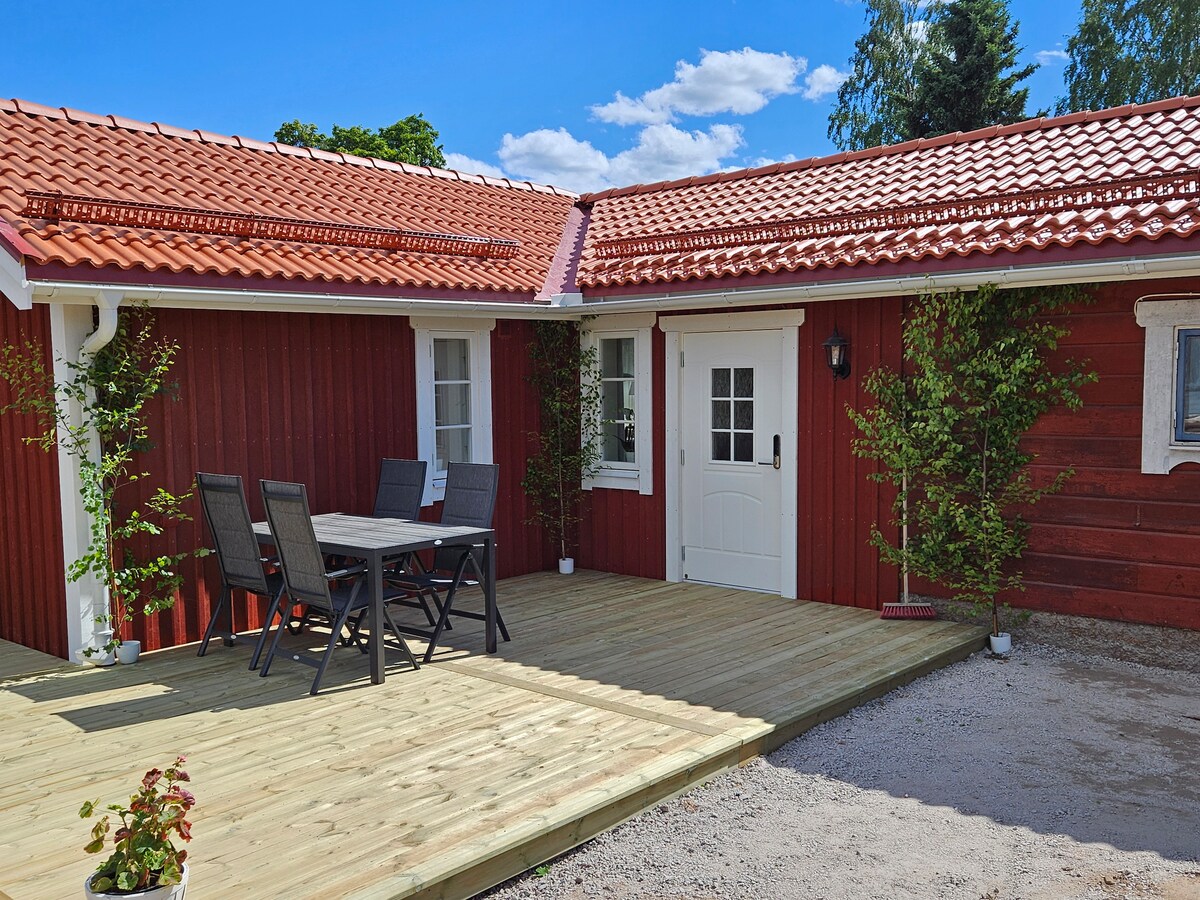 El alojamiento es una zona de invitados independiente en la casa con entrada propia. Consta de un dormitorio con una cama doble y un amplio salón con una litera, cocina y zona de estar. El baño tiene inodoro, ducha y lavadora. Un gran balcón da al lago, con asientos bajo una pérgola, y los huéspedes tienen acceso privado a todo el balcón. Es posible tomar prestado un bote de remos y chalecos salvavidas. Las toallas y sábanas no están incluidas, pero se pueden alquilar por 150 coronas suecas por juego. La limpieza no está incluida en el alojamiento.