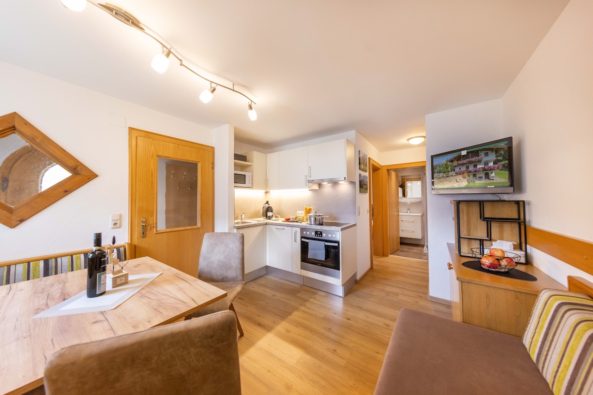 "Birnhorn" 2 Erw. incl. Tarjeta Saalfelden-Leogang, incl. Tarjeta de movilidad, wifi gratis Precioso apartamento recientemente renovado y amueblado moderno, 1 habitación doble, cocina, lavavajillas, nevera grande, vitrocerámica, hervidor, tostadora, cocedor de huevos, máquina de filtro + cápsula, vajilla, vasos, TV por cable de pantalla plana, comedor, sofá moderno, ducha, inodoro, balcón oeste + Impuesto turístico p.P/Nacht 2,50 EUR a pagar localmente + Billete de transporte por persona/noche 0,50 EUR a pagar en el sitio