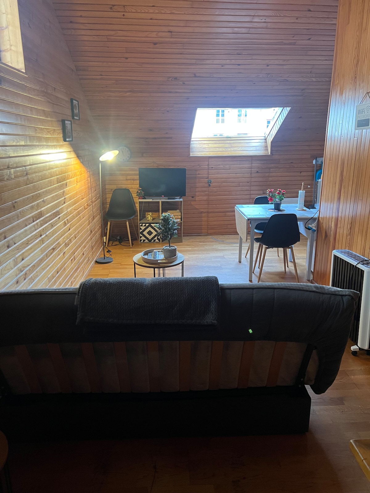 Relájate en este estudio tranquilo y elegante con decoración moderna y natural. El estudio está equipado con cocina(senseo) , baño y dormitorio con cama doble +sofá BZ Tendrás la oportunidad de relajarte en la terraza con sillas y mesa, así como de descansar en una piscina climatizada equipada con tumbonas para tomar el sol y spa. El estudio tiene una entrada independiente con llave, así como una puerta ventana contigua a la terraza ( anuncio en la esquina correcta)