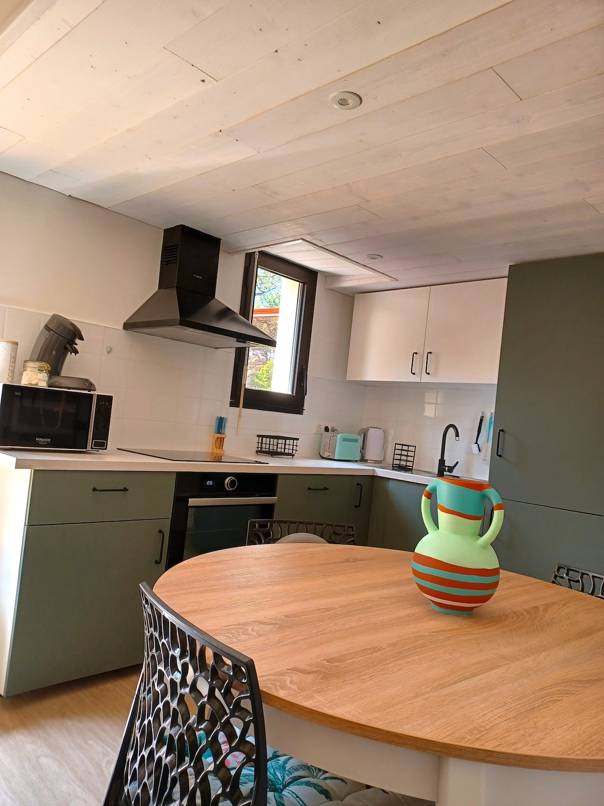 Antigua bodega reformada en vivienda con todas las comodidades: No hay vecinos, hermosa habitación (cama de hotel 160x200) con ducha a ras de suelo, grandes ventanales, cocina totalmente equipada, lavavajillas. Ropa de cama , toallas, paño de cocina, foutas playa incluida. Este es un verdadero 'nido acogedor', tranquilo, soleado, hermosas prestaciones y ubicación privilegiada en pleno centro del pueblo. Lugar atípico, pareja ideal. Para unas vacaciones de ensueño, descanso.