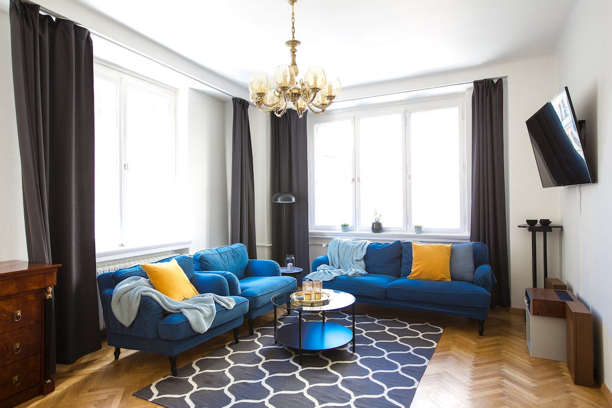 Encantador y muy amplio apartamento para seis personas con tres dormitorios privados, cómoda sala de estar con TV inteligente y cocina totalmente equipada. Ubicado en la mejor parte de Praga que se puede pedir. ¡El barrio está rodeado de los mejores lugares gastronómicos y los lugares de interés están a poca distancia a pie! ¡Disfruta de tu estancia en Praga con nuestro mejor servicio! Ofrecemos registro las 24 horas, almacenamiento de equipaje gratuito en nuestro hotel y también aparcamiento gratuito.