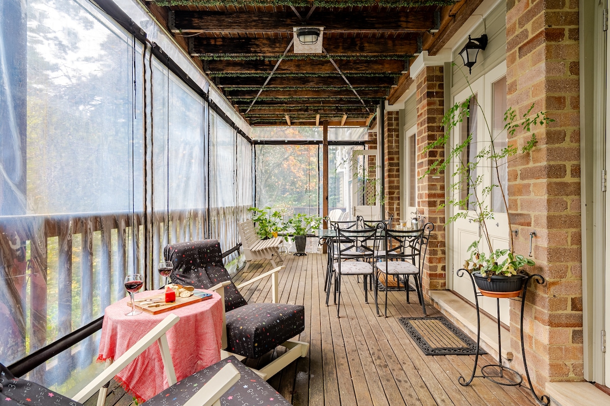 Studio White se encuentra en la parte delantera de una residencia de arquitecto de nueva construcción. Es moderno y espacioso, con un altillo enrejado sobre la sala de estar y se accede por escaleras de caracol italianas. La sala de estar inferior tiene una chimenea que se abre a una gran terraza con vistas al jardín y al estanque. Vivimos tranquilamente en una parte muy separada del edificio. Está decorado con buen gusto y con algunos toques especiales que te recuerdan que estás en las hermosas Montañas Azules.
