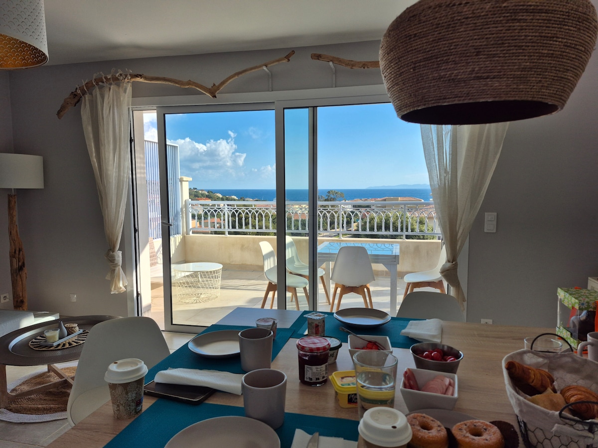 Emplacement de qualité la villa bénéficie d’une positon dominante nous louons une partie de notre maison de 50 m2 qui est climatisée. La terrasse surélevée privée avec une magnifique vue un ravissant bassin bali privé non chauffé oscillant entre vert émeraude et lagon bleu admirer le couché du soleil. Vous êtes à 5mn à pied du village et restaurants,5mn en voiture cabane de fruits et légumes..., 10mn des plages et d’Ile Rousse. 🙂LE LOGEMENT N’EST PAS ADAPTÉ à l’accueil d’enfants en bas âge.