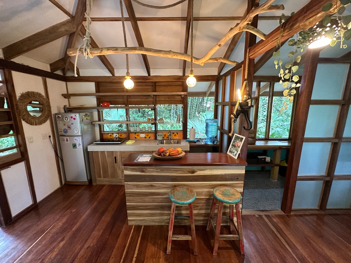 Dear travelers, this is not exactly a treehouse, but we decided to call it that because many of our guests describe the experience as feeling like being up in a tree. The cabin is located in the rainforest and only 5 minutes walk to Cocles beach and pristine Bluff Beach (just in front of Pirripli Island.) We currently have a 100 MB stable connection so it is a great option for people who need to work during their holidays. The access road is flat, easy walking for everyone and no 4x4 is needed