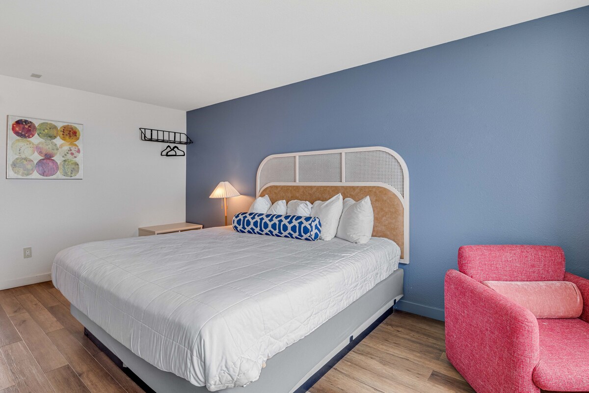La suite King Studio ofrece una espectacular vista panorámica frente al mar. La habitación principal ofrece una cama tamaño king con TV de pantalla plana de 50 pulgadas, cómoda, mesa de actividades y sillas. Pequeña cocina con microondas, nevera, cafetera Keurig, fregadero, cristalería y utensilios. Baño con ducha a ras del suelo, secador de pelo y artículos de tocador de primera calidad. Se admiten mascotas (solo perros).