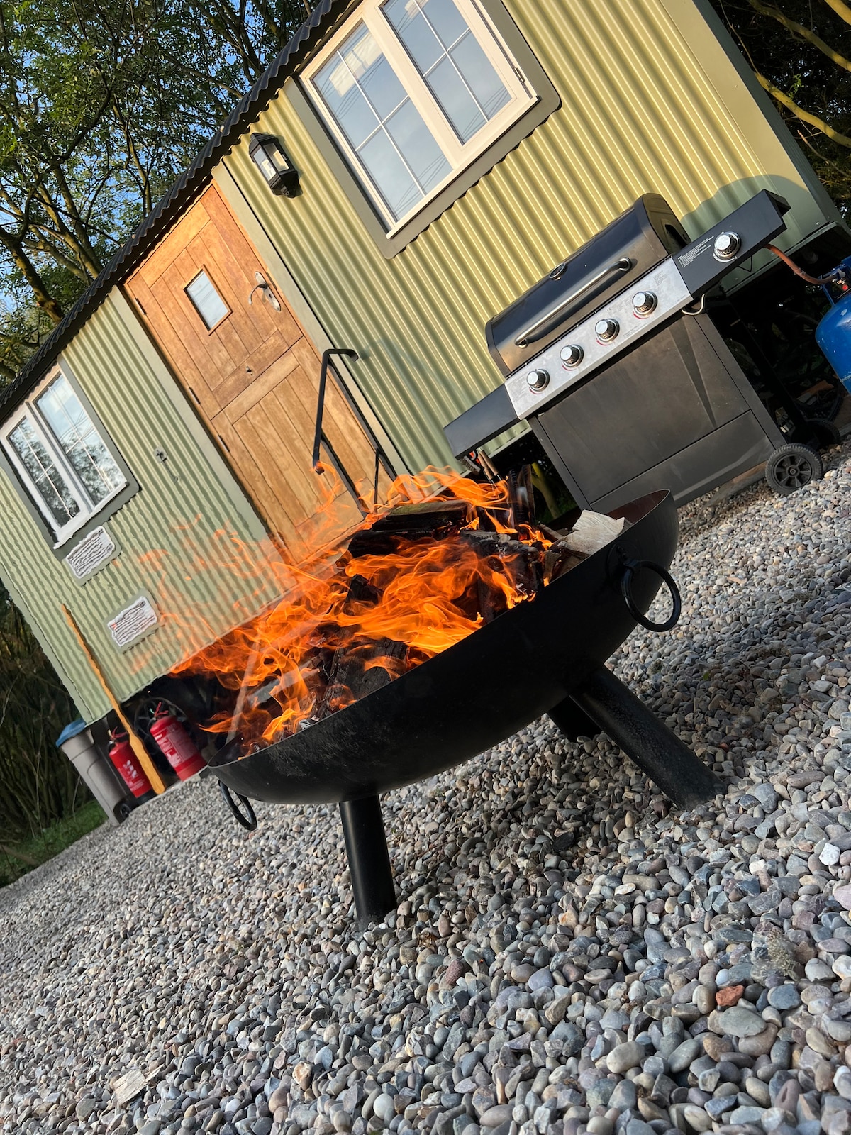 Una casa de pastores con una bañera de hidromasaje privada ubicada en Lincolnshire wolds La cabaña tiene una cama doble y zona de lavabo, con una placa caliente eléctrica de 2 anillos para cocinar, microondas, hervidor de agua y tostadora, también una nevera de tamaño camping. Se proporcionan toallas de mano y toallas de té. Para las noches más frías, hay un calentador eléctrico y una manta eléctrica. El área exterior tiene un asiento en el patio y un juego de mesa, y una barbacoa. Hay 2 baños y duchas cerca con un inodoro separado.