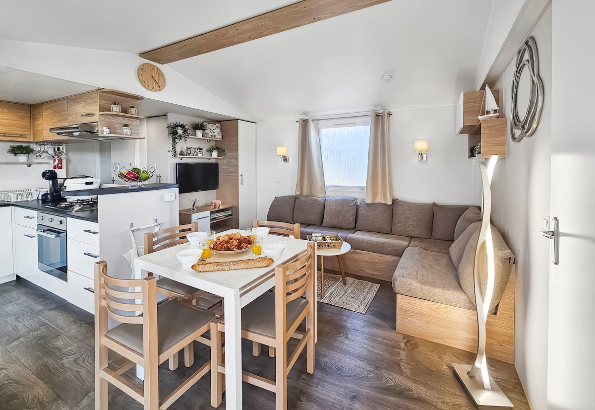 ¡Una experiencia rara! Bienvenido a Les Hérons Bleus, espaciosa casa móvil Beachcomber espaciosa, muy bien equipada y con un ambiente cálido, idealmente situado en un lugar junto al agua, tranquilo y cerca de las infraestructuras y áreas de juego del camping de 4 estrellas SIBLU. Con su gran terraza cubierta para relajarse y comer, este es el lugar perfecto para unas vacaciones en familia. ¡Camas hechas a la llegada y toallas proporcionadas para una estancia sin restricciones! Aparcamiento privado.