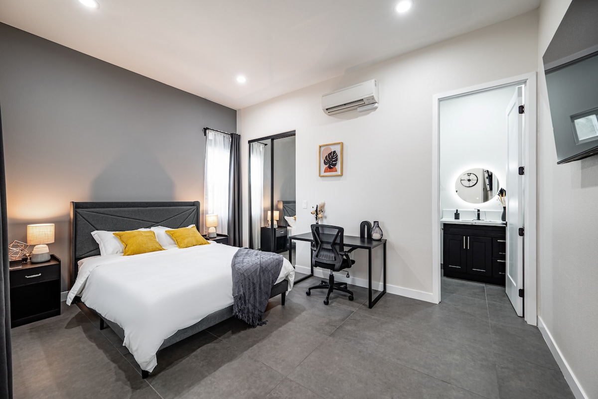 Bienvenido a nuestro encantador estudio ubicado en el corazón de Midway City. Perfectamente diseñado para la comodidad y la conveniencia, este elegante refugio ofrece todo lo necesario para una estancia inolvidable. Entra en un espacio acogedor y meticulosamente cuidado, donde los servicios modernos se combinan con toques reflexivos. El estudio cuenta con una cómoda cama tamaño queen. La cocina compacta pero bien equipada te invita a preparar tus comidas favoritas, con un comedor para disfrutarlas con estilo.