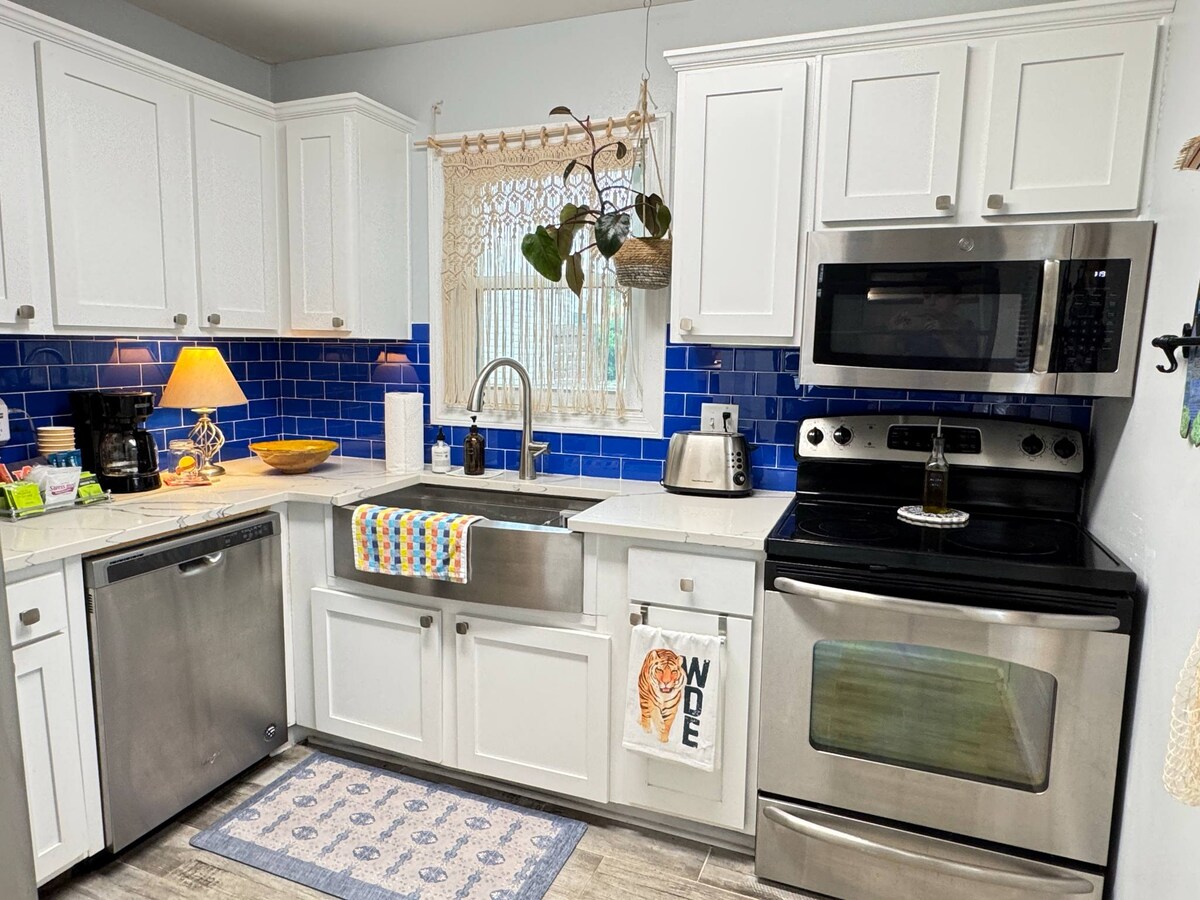 Adéntrate en el estilo de este loft de lujo junto a un arroyo burbujeante, donde la elegancia de una mansión inglesa se encuentra con el funk caprichoso. Las texturas aterciopeladas, el diseño atrevido y la banda sonora de la naturaleza (sí, las ranas suenan como una película de ciencia ficción) crean el ambiente. A pocos minutos de la Universidad de Auburn y a unos pasos de la piscina. Venga a ver por qué nos llaman el pueblo más encantador de las llanuras.
