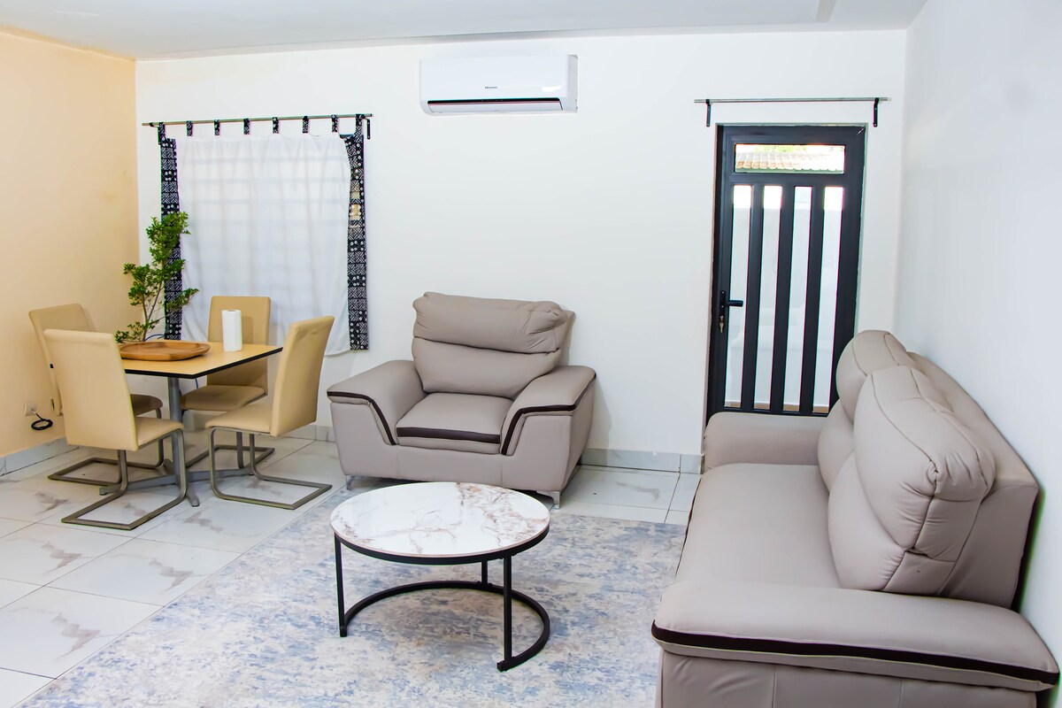¡Te damos la bienvenida a tu remanso de paz! Ubicado en una zona tranquila y segura, este magnífico apartamento F2 combina comodidad, modernidad y elegancia para ofrecerte una estancia inolvidable. Este alojamiento tiene una entrada personal, un jardín, una acogedora sala de estar y un dormitorio elegante y relajante: disfruta de una acogedora cama con sábanas de calidad hotelera para noches tranquilas. Ubicación: DISTRITO DE JAK, AKPKAKPA, COTONÚ LOS GASTOS DE ELECTRICIDAD NO ESTÁN INCLUIDOS (ver más abajo).