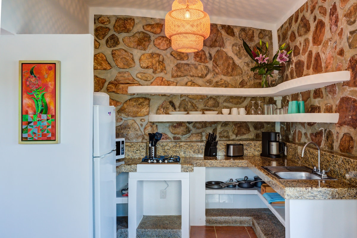 This a Cozy Bungalow for couple and Pets. It has a Kingsize bed air conditioner at the room with a renewed bathroon net to the bedroom. Complete Kitched with dining bar island, living room . Two terraces one at acces of the bundalow and one at the top of it with grill and Ocean View. The acces to the beach is just few steps from the property using public corredor.