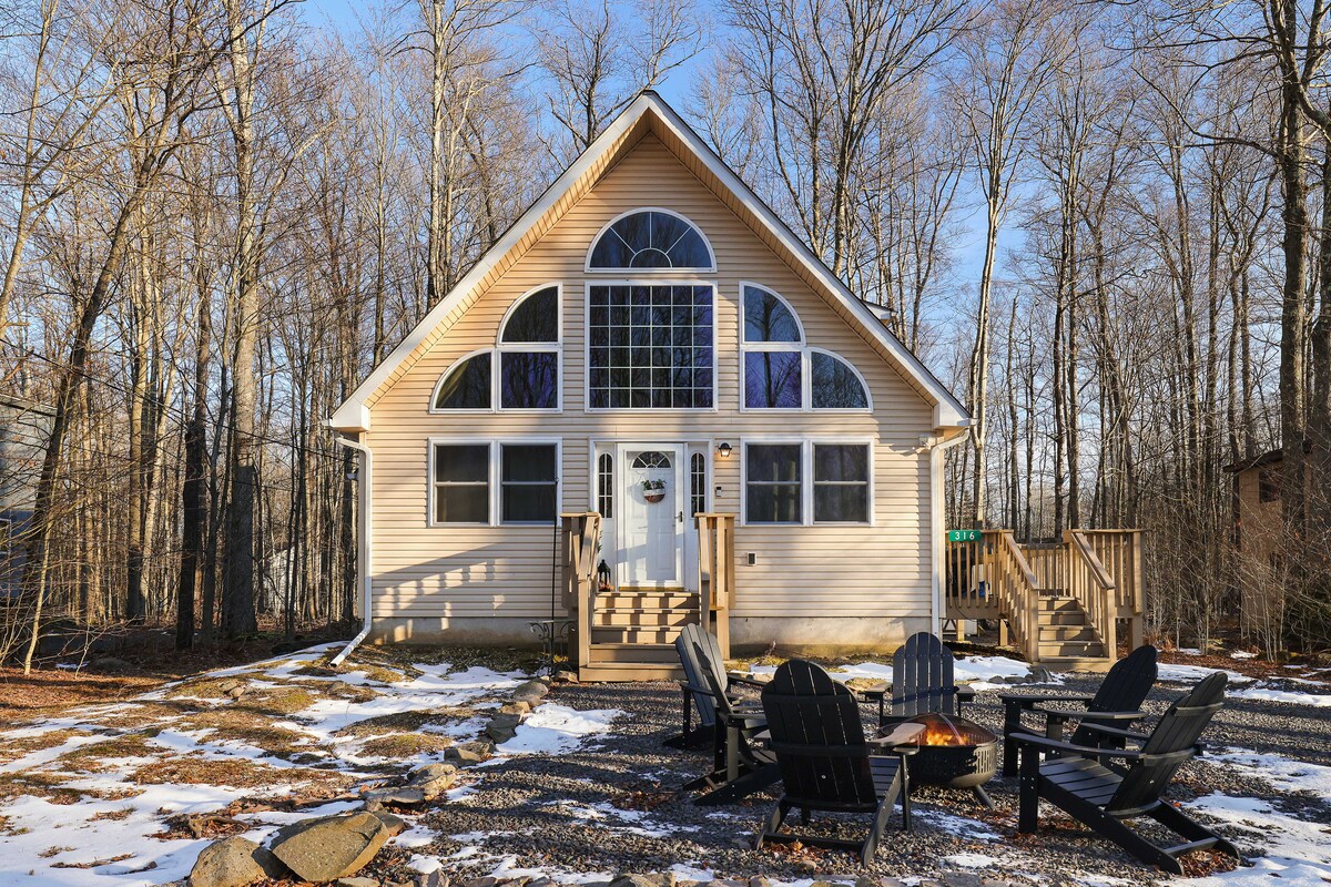 Escape to the Poconos and unwind at this cozy modern retreat in Arrowhead Lake. Ski and soak season is here — hit the slopes by day and relax in the oversized hot tub at night. Enjoy the firepit and fully loaded game room. This 3-bedroom home sleeps 10 and features a gas fireplace, 440 Mbps WiFi, and workspace. Includes access to Arrowhead Lake’s year-round amenities; close to outdoor adventures, skiing, hiking, snowshoeing, paintball. The perfect balance of fun, comfort, and mountain charm.