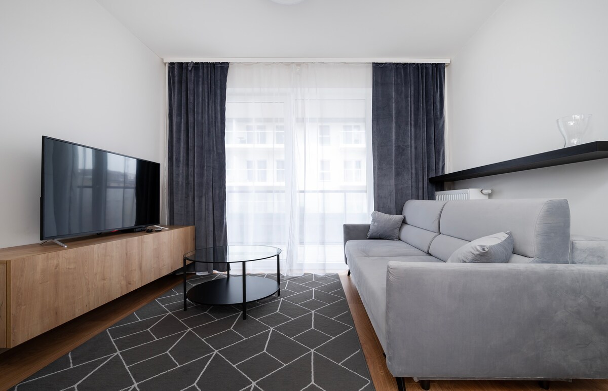 Spacious, modern apartment with a huge living room, a big balcony and a view over the city, in the heart of Lodz, but in a calm and quiet neighbourhood, located in luxurious estate. Close to the vibrant main street of the city - Piotrkowska with many restaurants and clubs. Beautiful park, tennis courts, concert and event halls, Expo Lodz, a cinema and a shopping mall in the neighbourhood, walking distance from the apartment. Have a great time in Lodz!