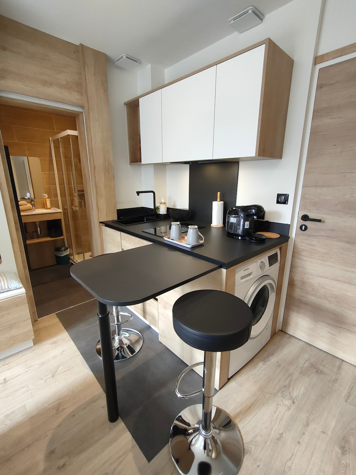 Studio avec entrée indépendante de 27m², vue sur la rivière. Lit électrique de 140cm . un canapé lit d'appoint : 10 € supplémentaire pour le couchage et fourniture des draps. . Coin cuisine avec four micro-ondes, plaques de cuisson, évier, frigo, vaisselles.... Salle de bains, douche à l' italienne avec eau chaude , lavabo, toilettes.