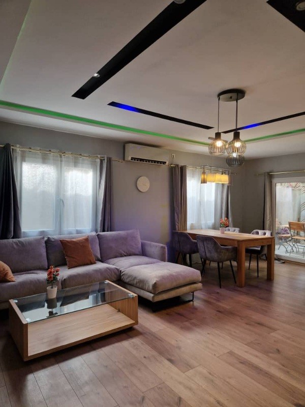 Un appartement est situé au rez de chaussée, moderne et spacieux, avec une cuisine ouverte sur le salon, équipée de tout le nécessaire. Une table, avec 4 chaises confortables et un canapé invitent à la détente. Le salon est équipé d'une TV incurvée . La chambre abrite un lit double, et la salle de bain équipée. L'appart dispose également d'une terrasse pour profiter de l'air libre. Les résidents ont une salle de gym collective et d'une machine à laver commune. L'ensemble est chic et fonctionnel