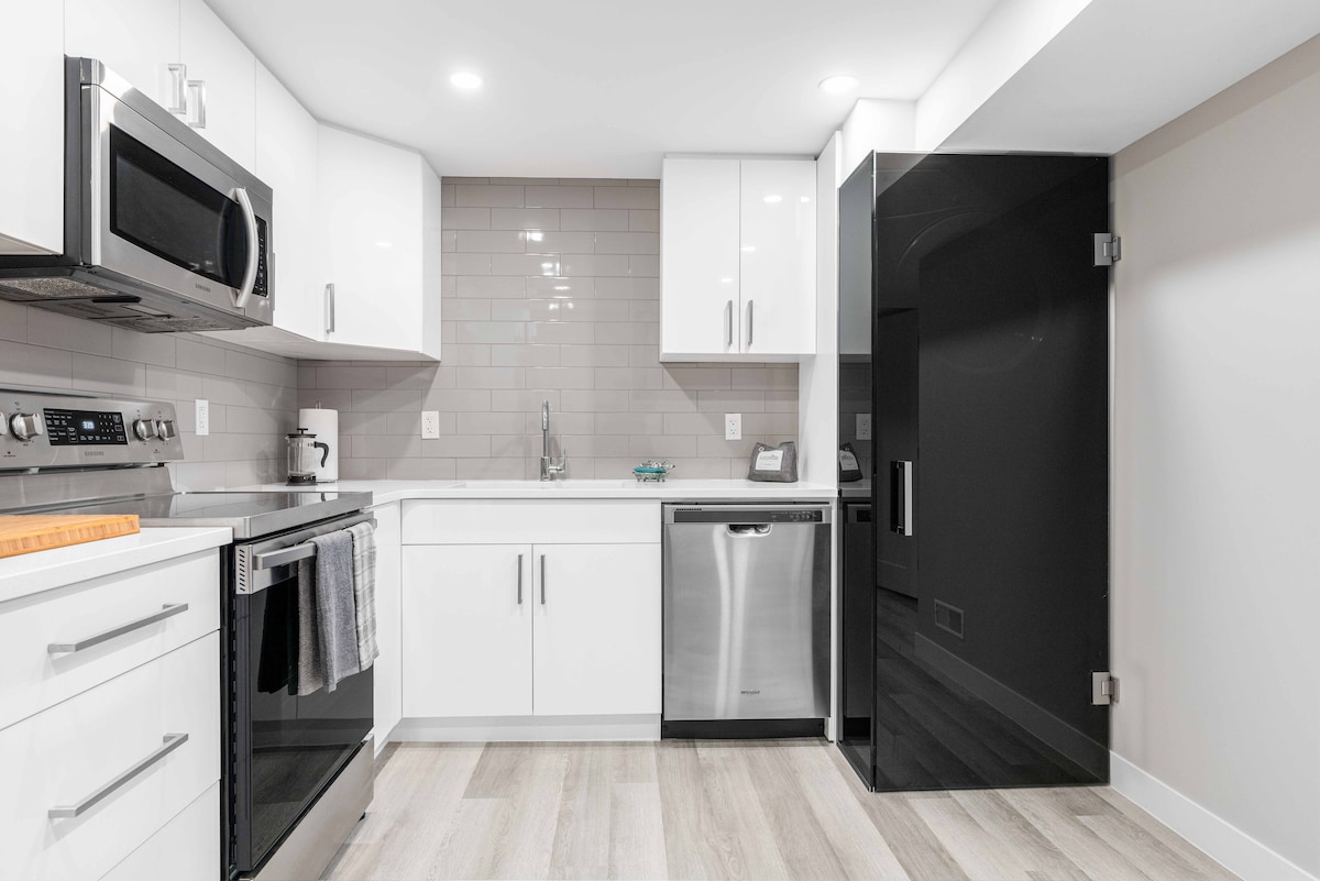 Este es un moderno dormitorio renovado para no fumadores. El espacio fue renovado y amueblado pensando en el huésped de Airbnb. Pisos nuevos de azulejos y planchas de vinilos de lujo en todas partes. ✔Bonita sala de estar con un televisor grande de pantalla plana. ✔WIFI de✔ alta velocidad de Netflix . ✔ Un lugar de estacionamiento GRATUITO. Este lugar está en el sótano, pero con mucha luz natural no se siente nada como una unidad en el sótano.