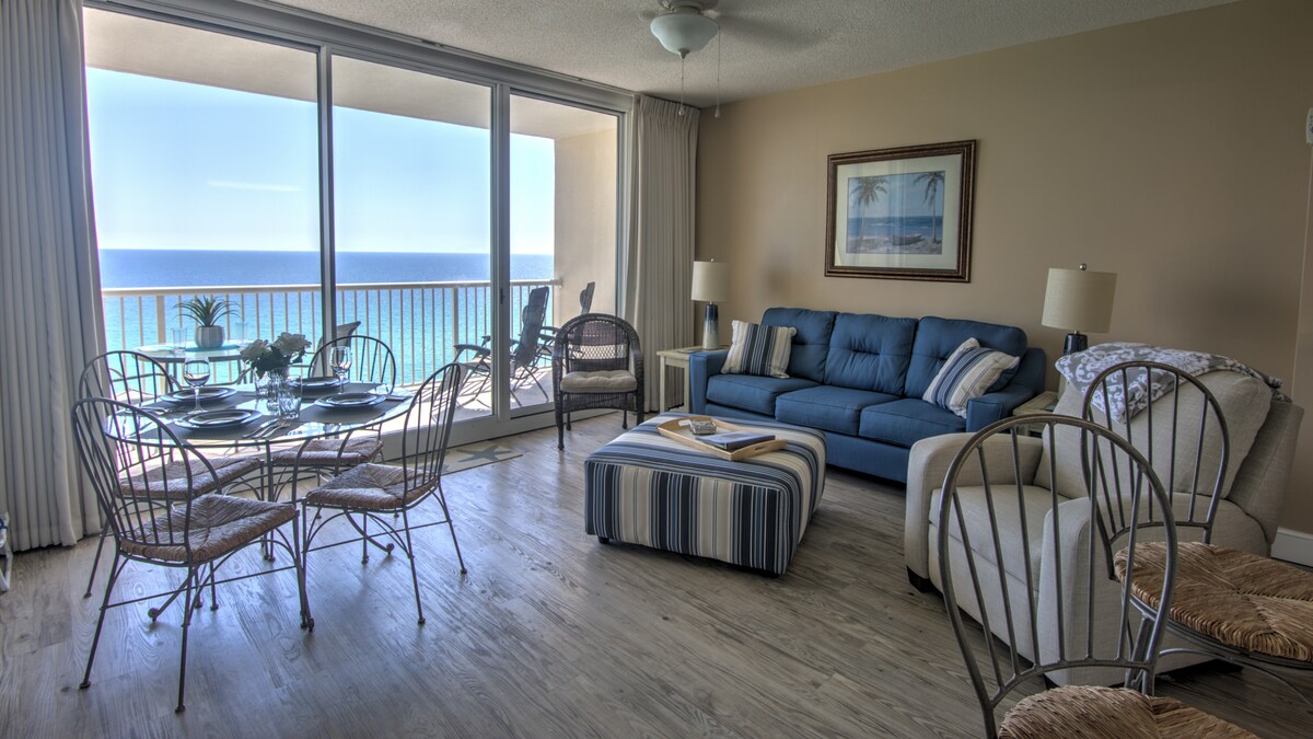 Este condominio de PLAYA FRENTE AL GOLFO tiene su propio estilo. Long Beach es una comunidad cerrada y cuenta con el tramo de arena más largo de PCB. Este condominio recientemente renovado en el séptimo piso tiene vistas panorámicas del Golfo desde cada habitación . Pisos de baldosas de cerámica de estilo español y encimeras de granito premium en todas partes. El enorme balcón curvo atrae puestas de sol espectaculares. El centro vacacional tiene una ocupación baja, por lo que los ascensores súper rápidos no lo dejarán esperando. El centro vacacional tiene una edad mínima de 25 años para poder reservar.