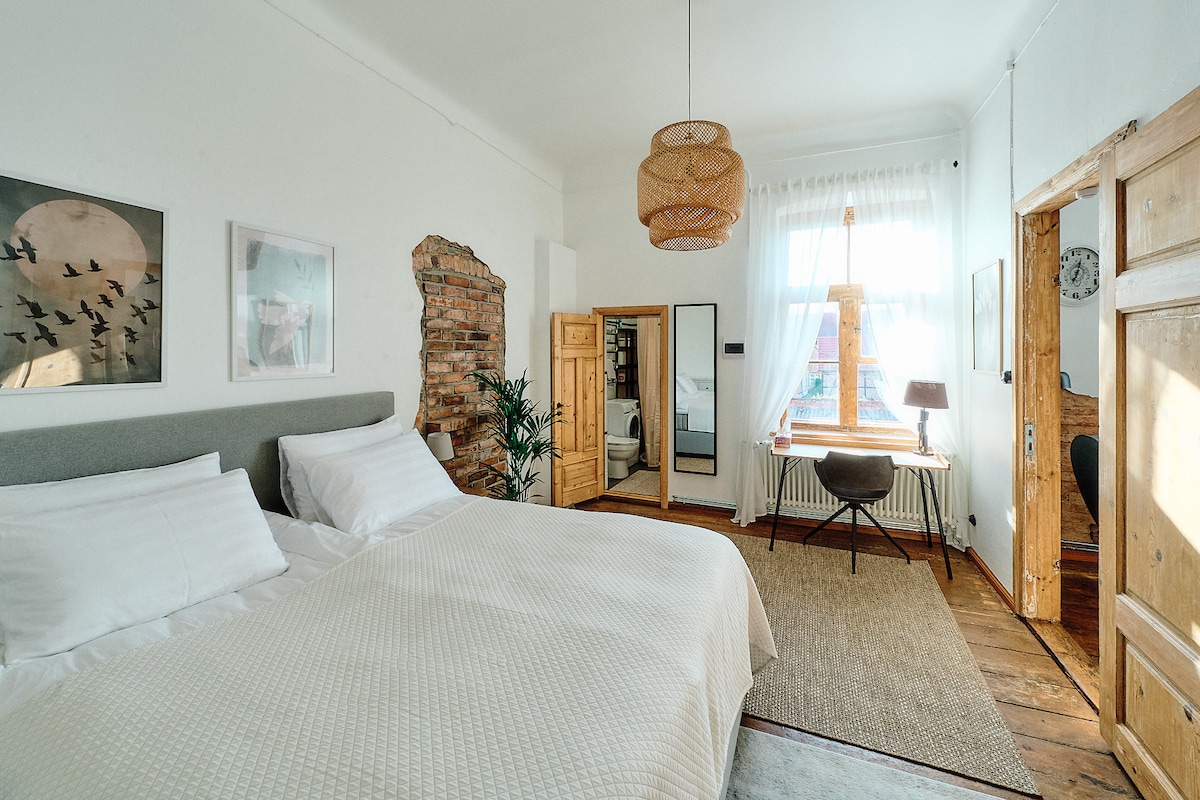 Este alojamiento céntrico te ofrece todo lo que necesitas. Aparcamiento privado en el patio, cama cómoda y cocina totalmente equipada. El apartamento está situado en una antigua casa de madera donde una misteriosa escalera te conduce a un luminoso y elegante apartamento tipo estudio (en el segundo piso). Todo lo que necesitas está ahí. Cafeterías a la vuelta de la esquina y las colinas del castillo de Viljandi a 10 minutos a pie.