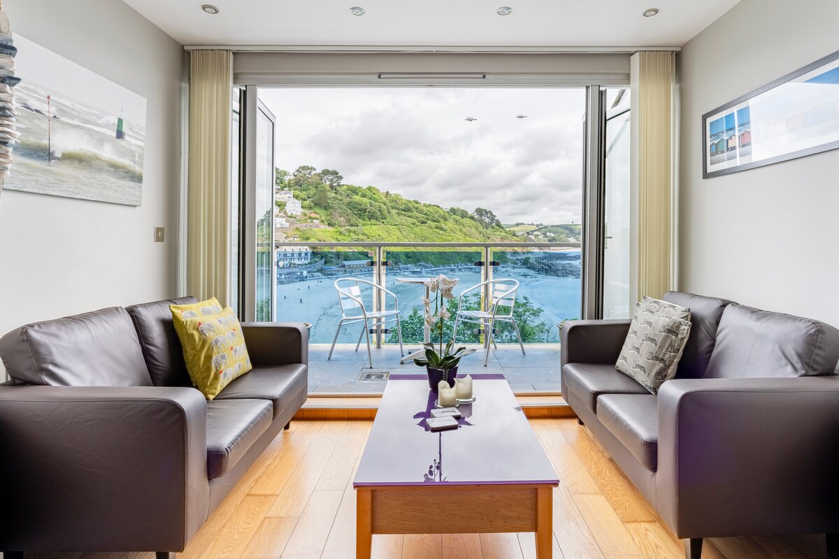 Este elegante y elegante apartamento es de una sola planta. Una base perfecta para una pareja, con o sin hijos. Hay un salón de planta abierta, con una cocina bien equipada, 2 cómodos sofás, (uno de ellos un sofá cama, solo para niños) comedor y hermosas vistas a la playa y al mar. Hay un Smart TV. El dormitorio doble principal tiene un amplio espacio de almacenamiento y una ducha y un inodoro en suite. Es un corto paseo panorámico (incluidos los escalones) a las tiendas/playa y el pequeño ferry para llevarte a East Looe.