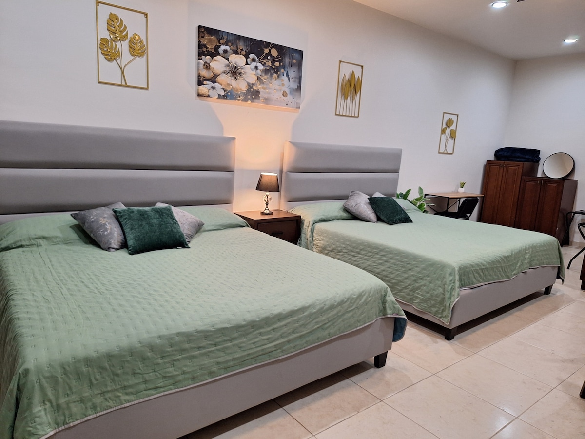 ¡Bienvenidos a su hogar lejos de casa! A dos cuadras del malecón y cinco del centro. Cuenta con una sala pequeña equipada con un televisor. La cocina tiene todo lo indispensable. La habitación, ofrece dos cómodas camas Queen, un clóset amplio y un elegante peinador. El baño está equipado con agua fría y caliente para su comodidad. Todo el espacio está climatizado con aires acondicionados nuevos, tanto en la sala como en la habitación. Disponemos de estacionamiento privado. Wifi.