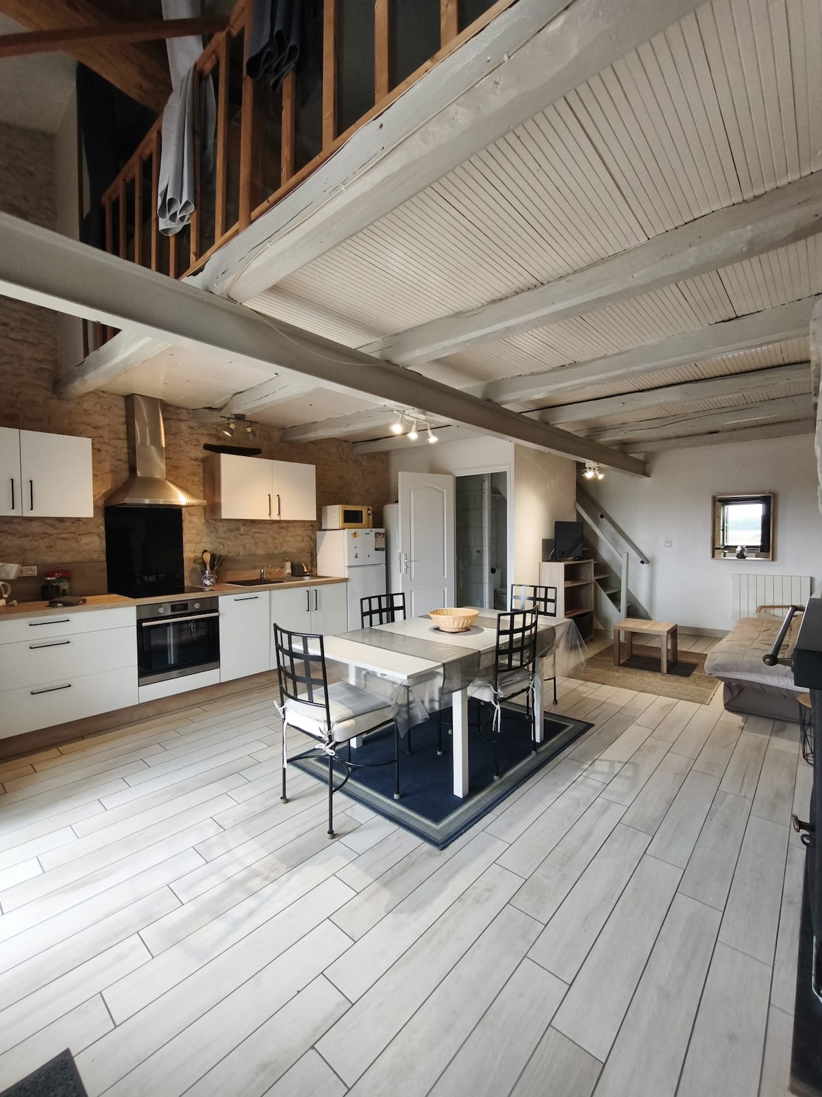 Casa de huéspedes independiente con decoración "New Yorkaise" en una antigua granja renovada rodeada de cerca con caballos con absoluta tranquilidad. también puede acomodar a 2 adultos y 2 niños. Entrada y estacionamiento privados, en la planta baja la parte de la sala de estar con sofá cama, televisión,barra de sonido bluetooth, Nespresso máquina, nevera,hervidor de agua. en la primera planta,la parte del altillo tiene vistas a la sala de estar donde se encuentra el dormitorio y el baño. La granja se encuentra en una encantadora aldea rodeada de bosque.