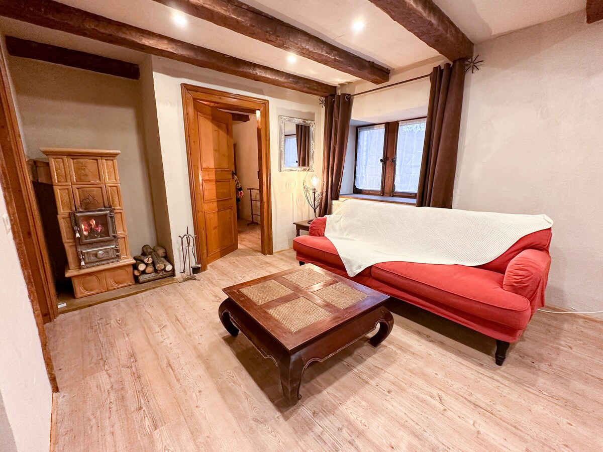 Ce logement classé meublé de tourisme 3 étoiles spacieux et familial est idéalement situé au pied du château-fort, cet hébergement vous offre un cadre chaleureux et convivial pour un séjour parfait Les amateurs de jeux y trouveront un billard + baby foot Vous pourrez profiter d'un sauna et d’une balneo - Arrivée autonome - 1 chambre avec lit queen size - 1 chambre avec lit queen size - 1 canapé convertible dans une chambre (draps non fournis ) - Wifi -Café, thé et mes bonbons préférés