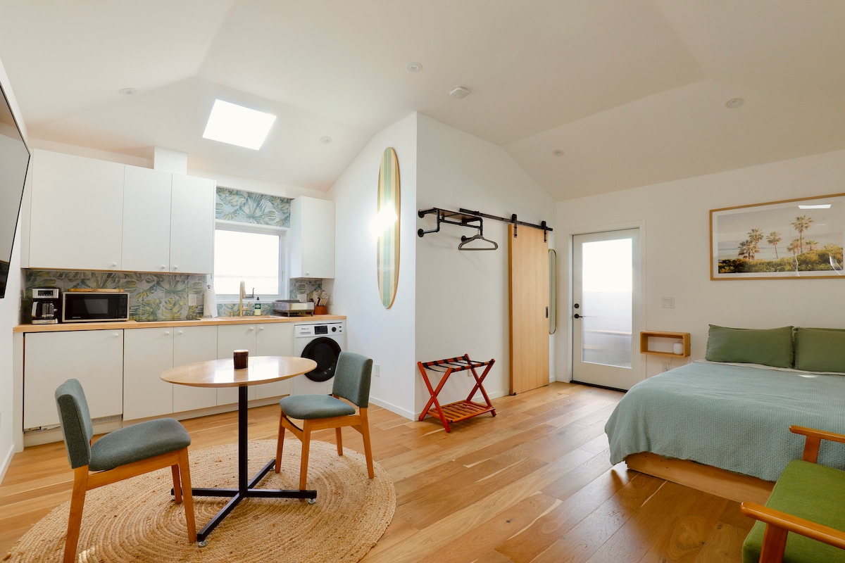Disfruta de este moderno refugio de estilo loft lleno de luz con techos altos y amplias paredes de vidrio. Prepara las comidas en la hermosa cocina con electrodomésticos y utensilios de cocina de primera línea. Terminada en 2017, esta casa de huéspedes inspirada en la Bauhaus apareció en la lista de GQ “Los mejores alojamientos en Airbnb en Los Ángeles”. Alimentado por paneles solares, ofrece un amplio plano de piso abierto, una terraza privada y una entrada sin llave. No te preocupes, estamos cerca para garantizar tu comodidad. Disfruta del lujo moderno en esta casa de huéspedes bañada por el sol.
