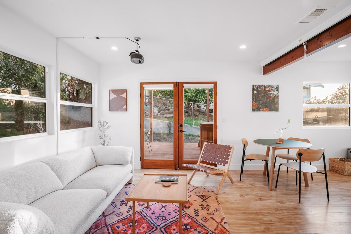 Disfruta de este moderno refugio de estilo loft lleno de luz con techos altos y amplias paredes de vidrio. Prepara las comidas en la hermosa cocina con electrodomésticos y utensilios de cocina de primera línea. Terminada en 2017, esta casa de huéspedes inspirada en la Bauhaus apareció en la lista de GQ “Los mejores alojamientos en Airbnb en Los Ángeles”. Alimentado por paneles solares, ofrece un amplio plano de piso abierto, una terraza privada y una entrada sin llave. No te preocupes, estamos cerca para garantizar tu comodidad. Disfruta del lujo moderno en esta casa de huéspedes bañada por el sol.