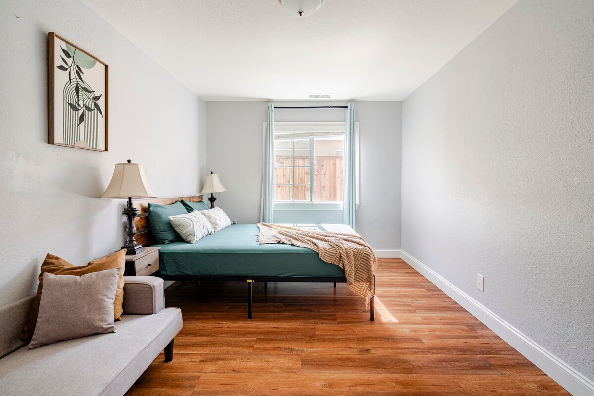 ¡Disfruta del Área de la Bahía en tu propia casa privada, pintoresca y cómoda! Contempla desde la ventana de tu dormitorio principal o sala de estar el césped verde y el patio trasero bordeado de árboles de bambú con árboles frutales y vallas de 6 pies. El alojamiento se encuentra en un barrio seguro y tranquilo, a 2-3 minutos en coche del centro comercial Oakridge. Convenientemente ubicado con todas las tiendas imaginables a 5 minutos en coche. Nuestra acogedora cocina completa contiene ollas, sartenes, platos, cafetera Keurig, arrocera, freidora de aire Ninja y mucho más.