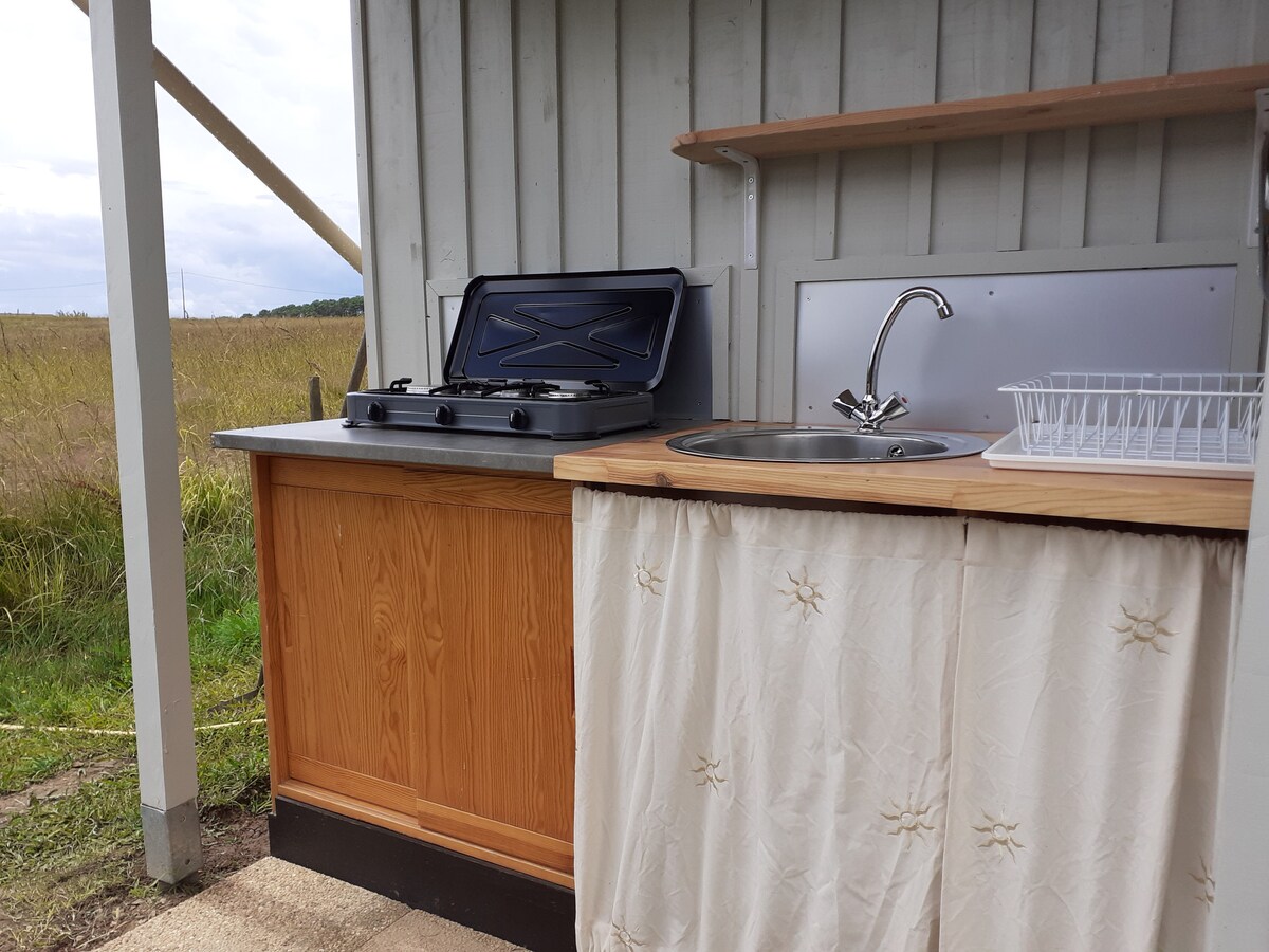 Entorno encantador y romántico en plena naturaleza, glamping concepto en casa de familia Experiencia entre la cabaña y el camping, Recuperación con la naturaleza Cocina exterior cubierta, plancha y quemador, cocina equipada + posibilidad de nevera (opcional) Ducha exterior solar y WC seco Tienda de meditación, relax o que se puede adaptar en 1 cama doble, Iluminación solar. Espacio privado y estacionamiento En medio de un bosque y su hábitat natural, observación de las estrellas hacia un espectáculo excepcional