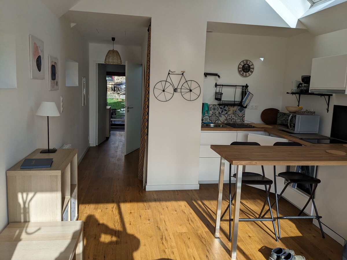 Bonita casita adosada pero con acceso independiente y un jardín en la parte trasera sin vecinos. Podrá disfrutar de la tranquilidad del lugar con la posibilidad de codearse con las 3 ânesses de la casa. 1 habitación con posibilidad de cuna y un sofá cama en la sala de estar. Cocina totalmente equipada con lavavajillas. Cerca de las tiendas ( supermercado a 1 km-farmacia-panadería ...) Muy cerca de la abadía de timadeuc y su queso, Josselin, Vannes...