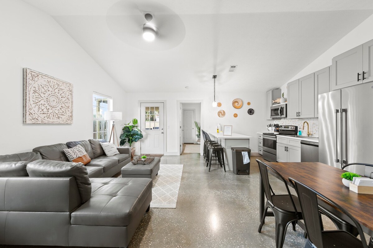 Beautiful beach house. Perfect for couples or a small family. Just 450ft walk to the beach! That's a 2 min walk! Entire upstairs is the master suite w/ attached bath & beautiful walk-in shower. Complete w/ a comfy king size bed. Main floor living room has a queen murphy bed(sofa isn’t the most comfy but I chose bed over comfy sofa) , a half bath, Full kitchen/dining area w/ everything you need for daily meals. A small fenced in yard w/ turf for pets. Smart tv, WiFi & laundry room.