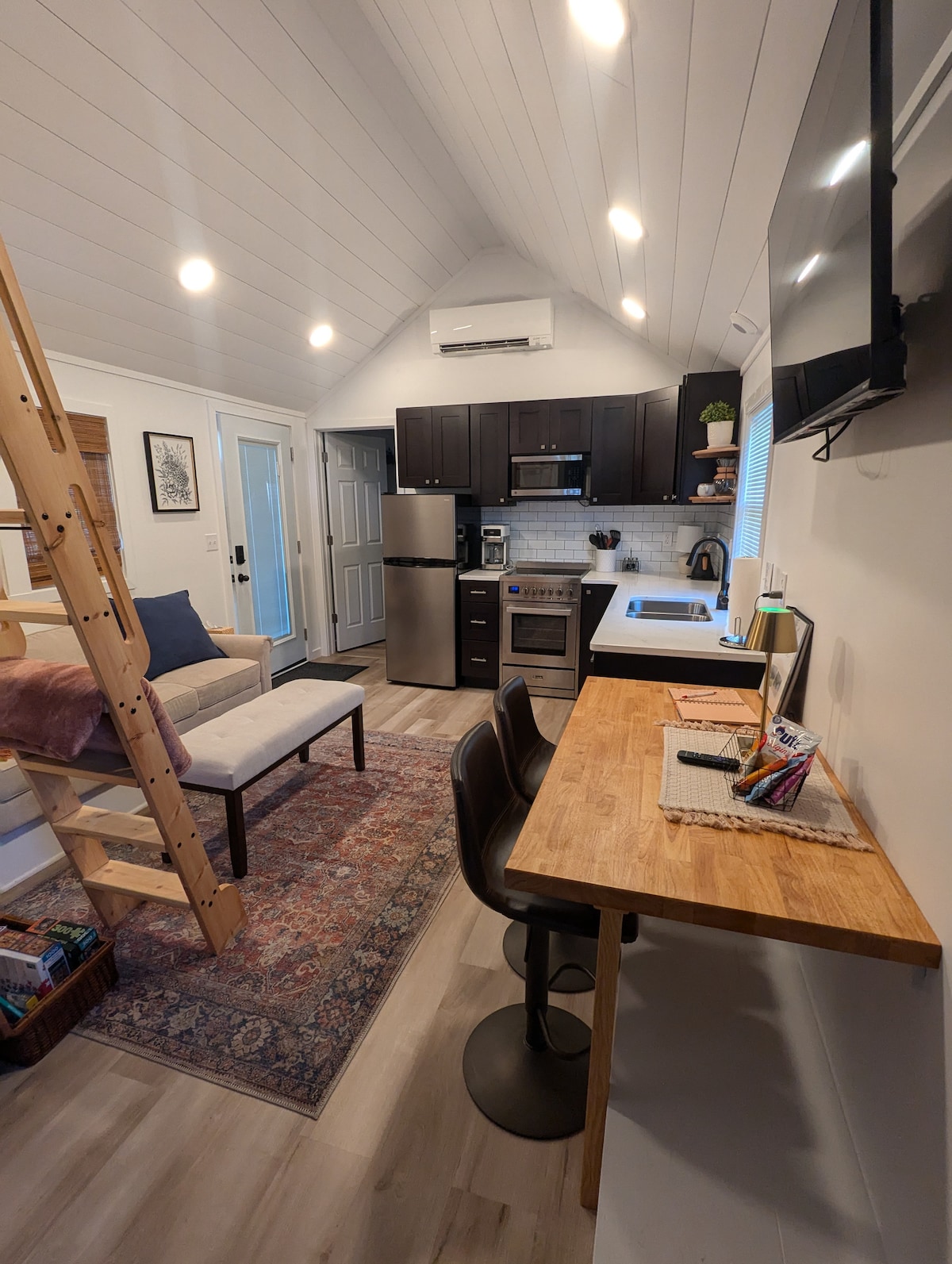 Kick back and relax in this calm, stylish space. This modern tiny home is located on top of a mountain and has spectacular views. Sit on the wrap around porch with your loved one or relax in the hot tub right outside the door and enjoy watching the wildlife. The interior has a modern design and you will experience a cozy and romantic atmosphere the moment you walk in. It truly is a perfect spot to unwind and reconnect with yourself, your loved one, and nature!