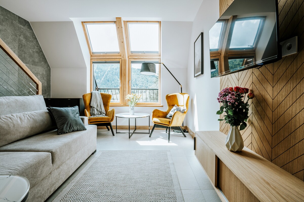 Casa de refugio estudio con una superficie de 33 metros cuadrados con balcón en un dormitorio extendido, con una hermosa vista a los Tatras occidentales. Espacioso interior de 4 metros terminado con madera de alerce. Una cama tamaño king de 180x200 cm con 2 camas individuales Cocina pequeña con lavavajillas, nevera, microondas, tostadora y cafetera. Un sillón extensible de 100 cm de ancho hace que el estudio sea cómodo para 2 o 2 personas con un niño. Baño abierto, inodoro con lavabo en habitación independiente.