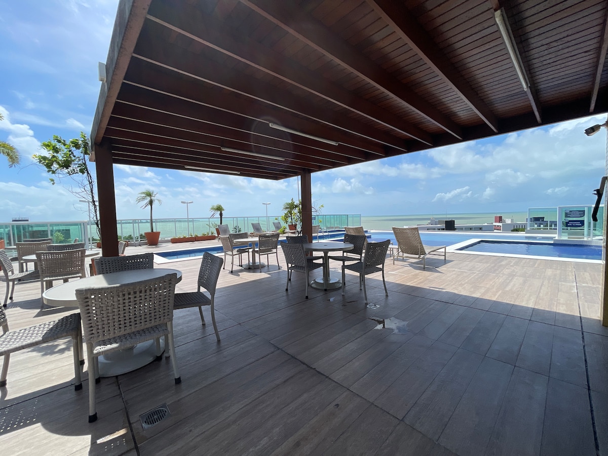 ¡Tenga un pedazo de paraíso a sus pies! Loft nuevo, recién amueblado, frente al mar de Bessa, perfecto para familias pequeñas (hasta 3 personas) o para viajeros individuales. Está dividido de la siguiente manera: ocio privado con jacuzzi y vista al mar privilegiada, suite doble con smart TV 50' y estación de trabajo, cocina compacta y completa con utensilios principales, integrada con el dormitorio, todo esto sumado a una hermosa vista del primer amanecer de las Américas.
