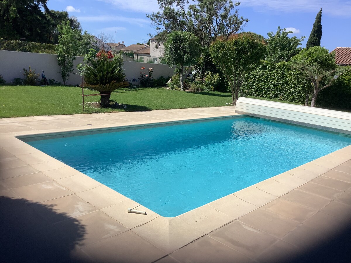 Bienvenido a nuestra hermosa villa en Lunel, ideal para unas vacaciones en familia con todas las comodidades necesarias y bien vallada: ✨ Piscina privada y jacuzzi para momentos de relajación 🛏️ 3 dormitorios (uno de ellos con tabique de persiana) 1 sofá cama en la sala de estar (8 camas) 🍽️ Cocina equipada y gran sala de estar luminosa 🌿 Terraza y jardín para comer al aire libre 🚴♂️ Actividades: paddles Idealmente situado entre Montpellier y Nimes, cerca de las playas y los lugares turísticos.
