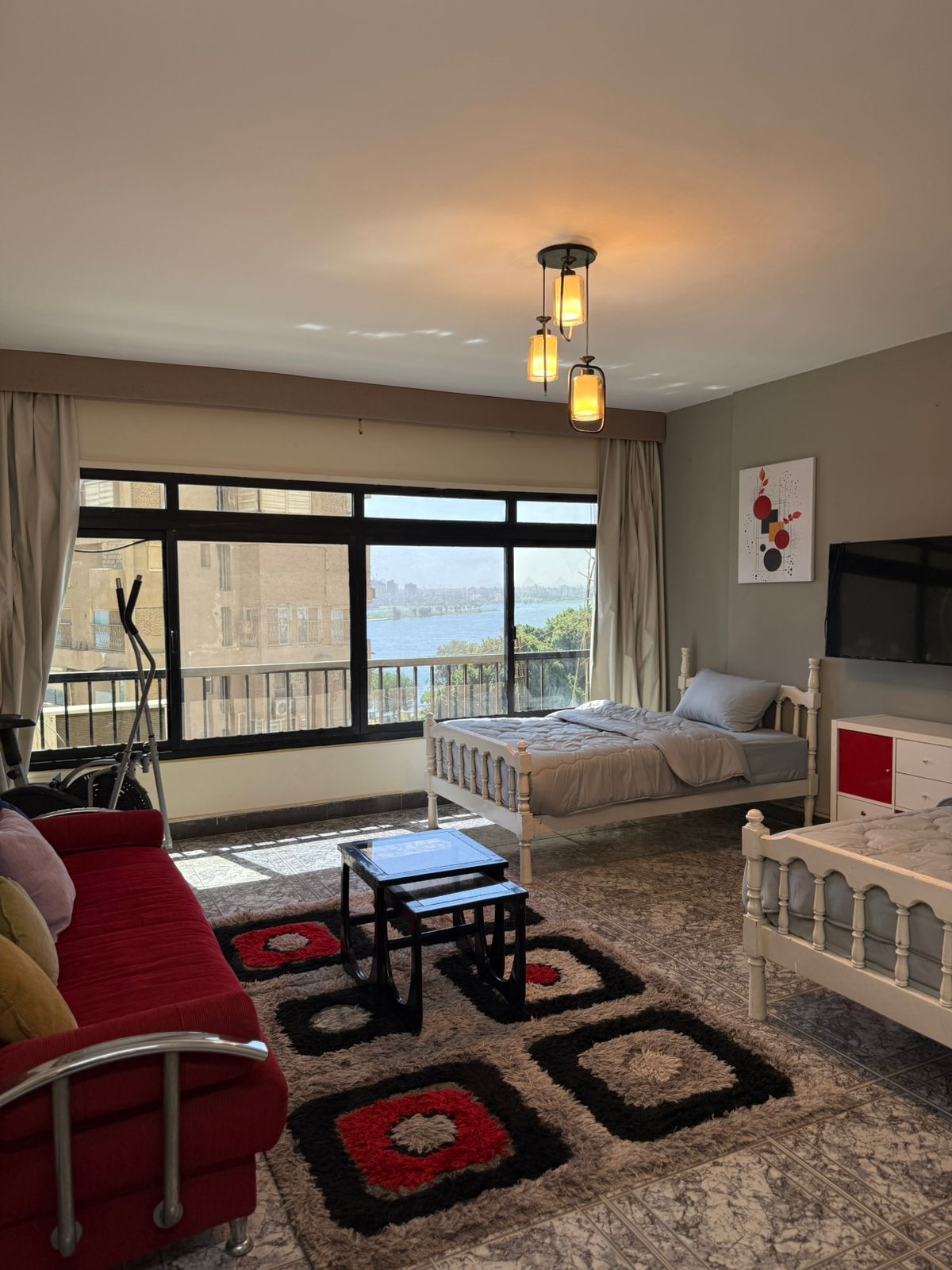 Relax in this spacious 3-bedroom apartment with breathtaking full Nile views 🌅🌊. Bathed in natural light and decorated in warm modern boho tones ✨🪴, it offers a peaceful riverside retreat. Enjoy the river from the living room or bedrooms 🛋️🛏️, unwind in the cozy seating area 🛋️, or cook in the fully equipped kitchen 🍳. Perfect for families or groups seeking comfort, space, and serene moments by the Nile 🌴🚤.