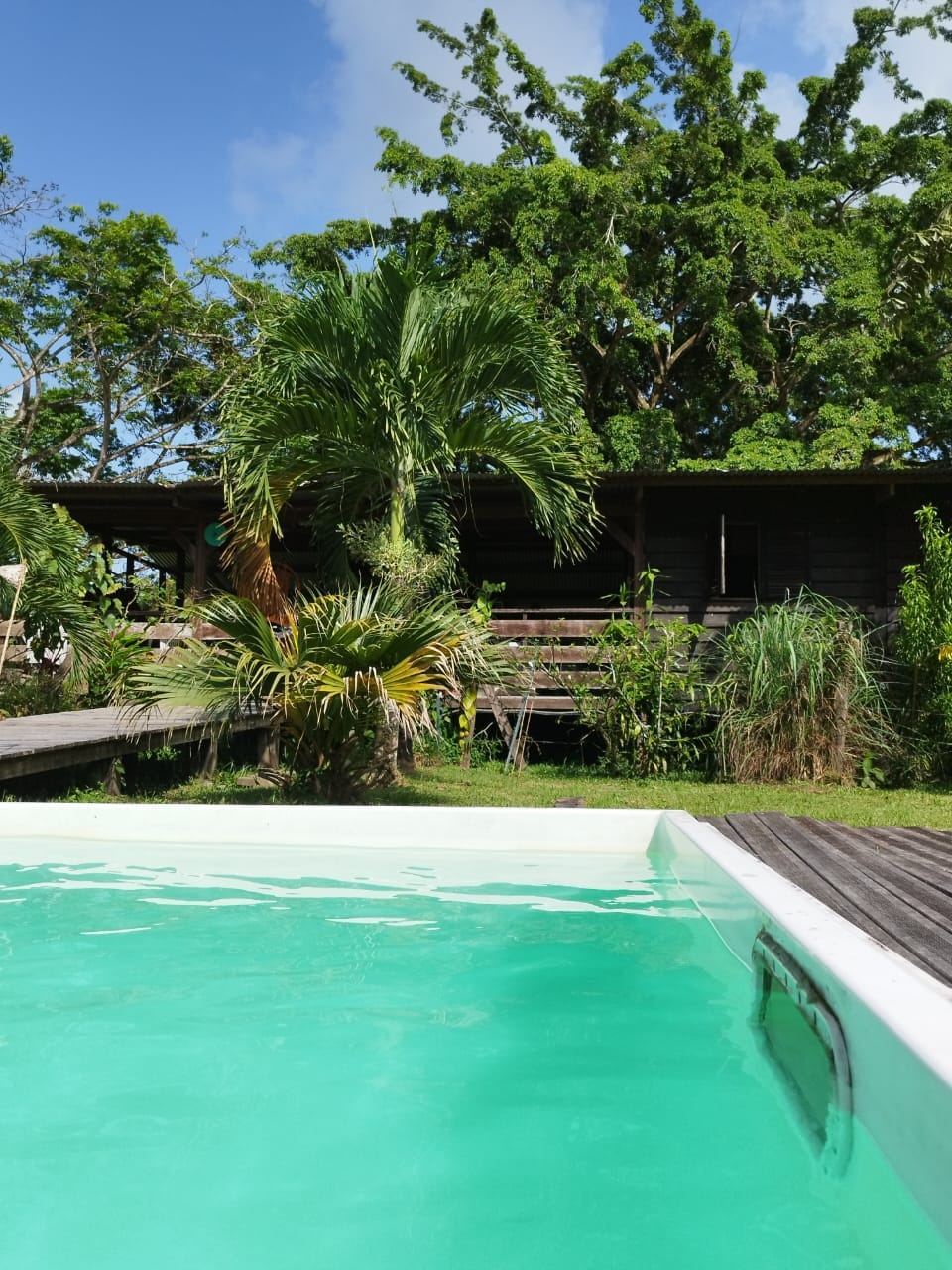 Carbet/casa de madera independiente, con dos habitaciones cerradas, terraza exterior, con cocina y baño (con agua caliente) abiertos al bosque. Tendrá acceso a la gran piscina de la propiedad y a un estacionamiento privado (2 coches máx.). Wifi por fibra óptica Jardín frutal y ornamental de una hectárea de permacultura. Lugar tranquilo y apacible para los amantes de la naturaleza y la simplicidad, donde los morfós y colibríes vendrán regularmente a visitarlo.