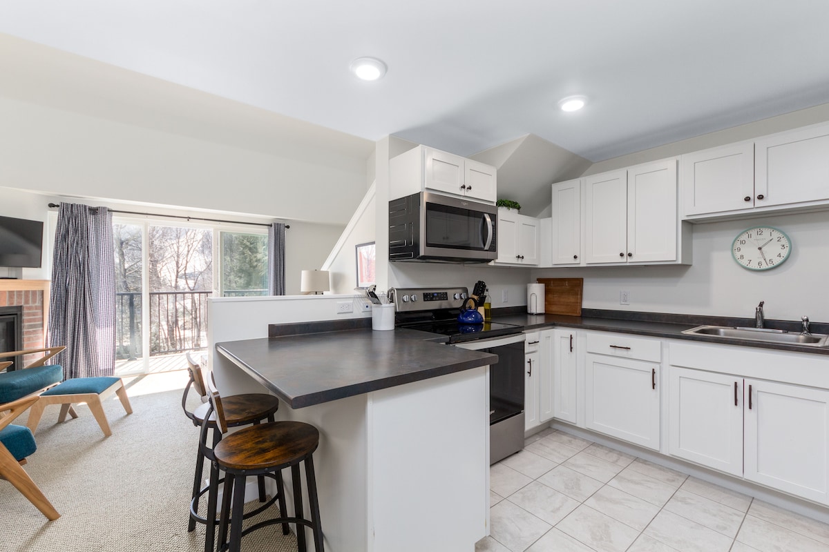 Fully renovated in 22/23 a high-end, modern, farmhouse style 2,000 sqft open floor plan condo/apt, with 2 large decks and outdoor space, with a firepit and newly installed AC and private access to Hot Tub! Perfect for entertaining and family gatherings. The living room, kitchen, and dining room are all open with lots of seating. In the summer and fall, open the doors to the expansive decks with an outdoor dining table, couch, and hammock! Enjoy family/friend time with a fire in the backyard.