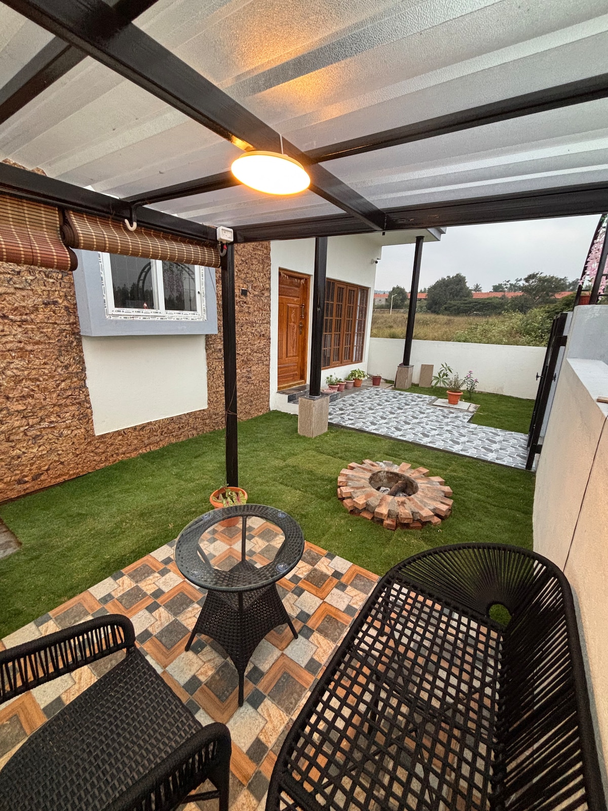 AURA'S NEST | Private 2BHK Villa | Young Groups & Couples ROOM FEATURE Bedroom:Clean bed & mirror Living:TV Streaming & cozy space Bath:Soak in Big-Bathtub Outdoor: Bonfire or BBQ Kitchen:Gas Stove Utensil & Fridge Dining:Pub Style ON DEMAND Help Oncall Food Swiggy/Zomato Cab Ola/Uber Spa UC app AMENITIE Fridge to Cool beer Cooling 35L Aircooler Power inverter Pond Outdoor Seating NEARBY Concert:Embassy Ridding school,Terraform Pubs & Café Lakes for Scenic view Vineyard for winetour