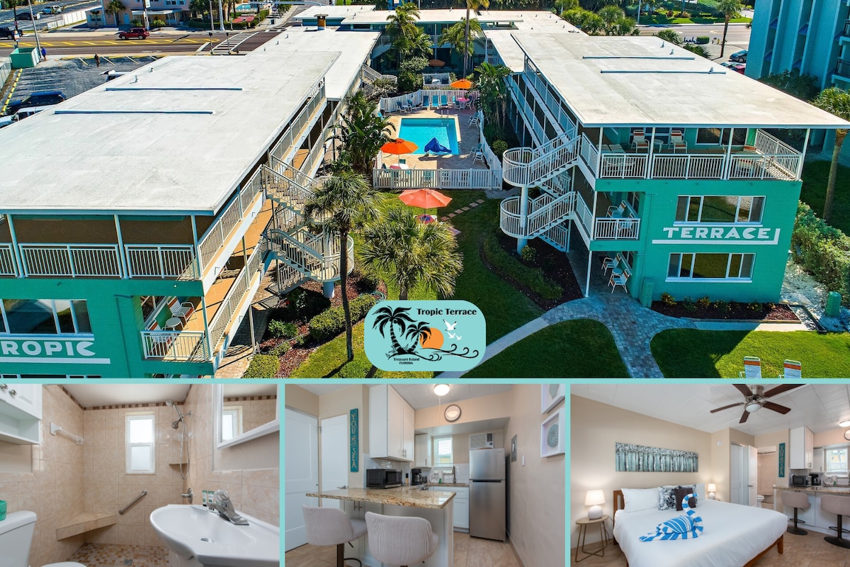 Tropic Terrace Suite #54 – Classic Charm with a Poolside View Studio | 265 Sq Ft | Pool-Facing | 2nd Floor | No Elevator Welcome to Suite #54 at Tropic Terrace Resort, a cozy studio retreat located directly on the pristine sands of Treasure Island. This thoughtfully designed unit blends vintage Florida charm with comfort, offering the perfect spot to relax after a day in the sun.