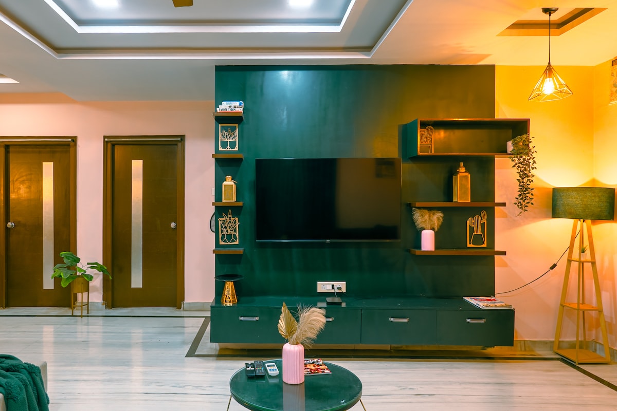 Luxurious, homely, secluded and only 5 mins from Hi-Tech City, this Full-Floor Apartment on the 2nd Floor is perfect for: - Family of 2-15 ppl, Wedding guests, NRI's etc, who need a centrally located home & daily maid service. - Remote working employees who need high-speed Wifi, a fully stocked kitchen & Inverter power back-up. - Couples who want a short term staycation & Chill in front of a 50" 4K-smartTV - Friends who need a private place to hangout in the city SELF-CHECK-IN using Smart Lock